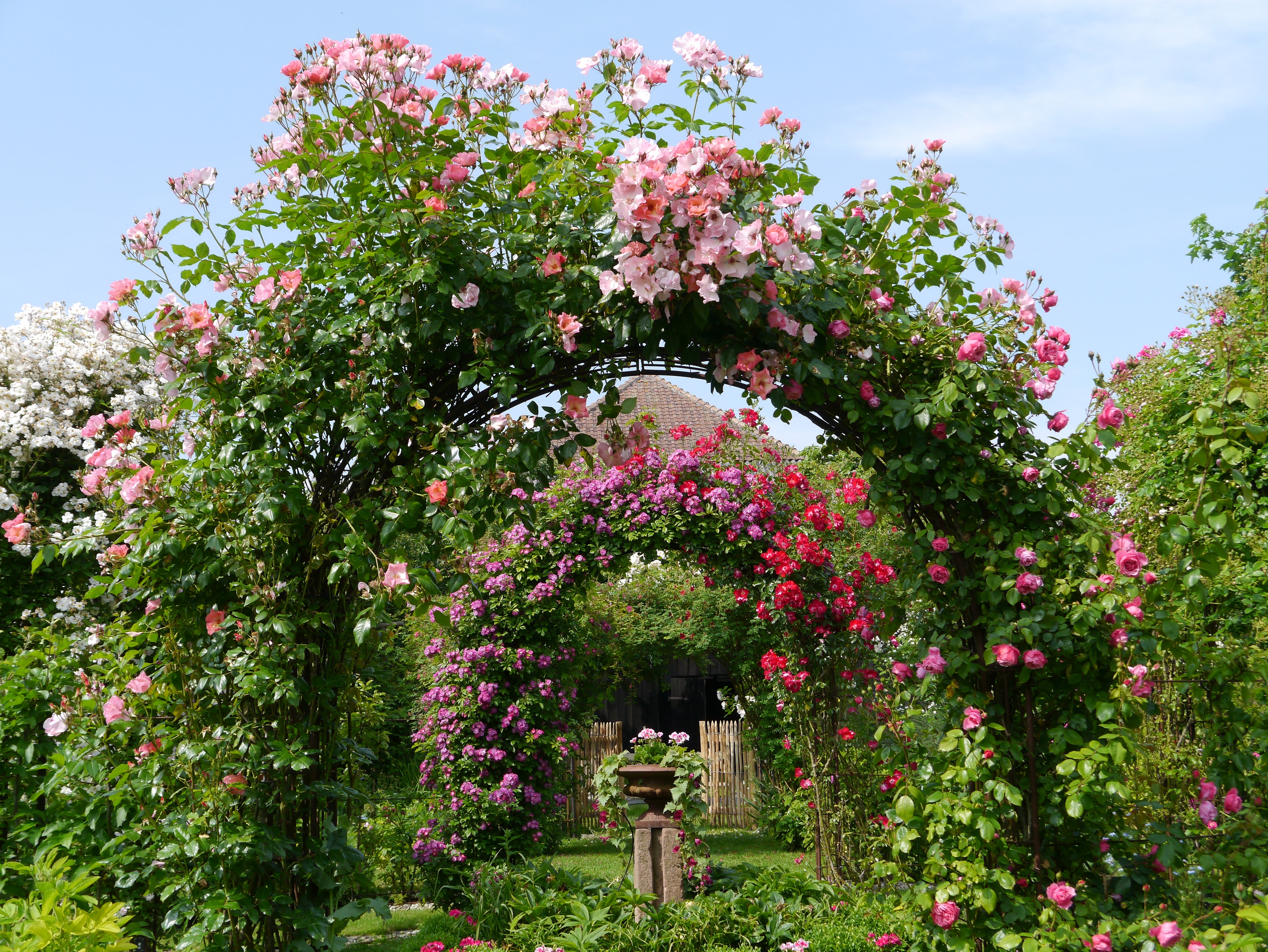 Darum herum stehen in zwei konzentrischen Kreisen Rosenbögen und Spalierobst-Gerüste sowie niedere Wildrosenhecken.