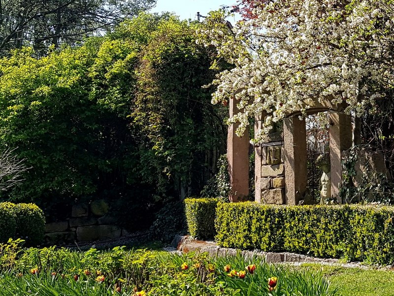 Viele durch besondere Blütenpracht und Rinden- und Blattfarben und -formen auffallende Gehölze bilden den Rahmen. Exoten finden sich neben Einheimischen. Sich selbst versamende Frühlings- und Sommerblumen sorgen an vielen Stellen des Gartens für Farbtupfer.