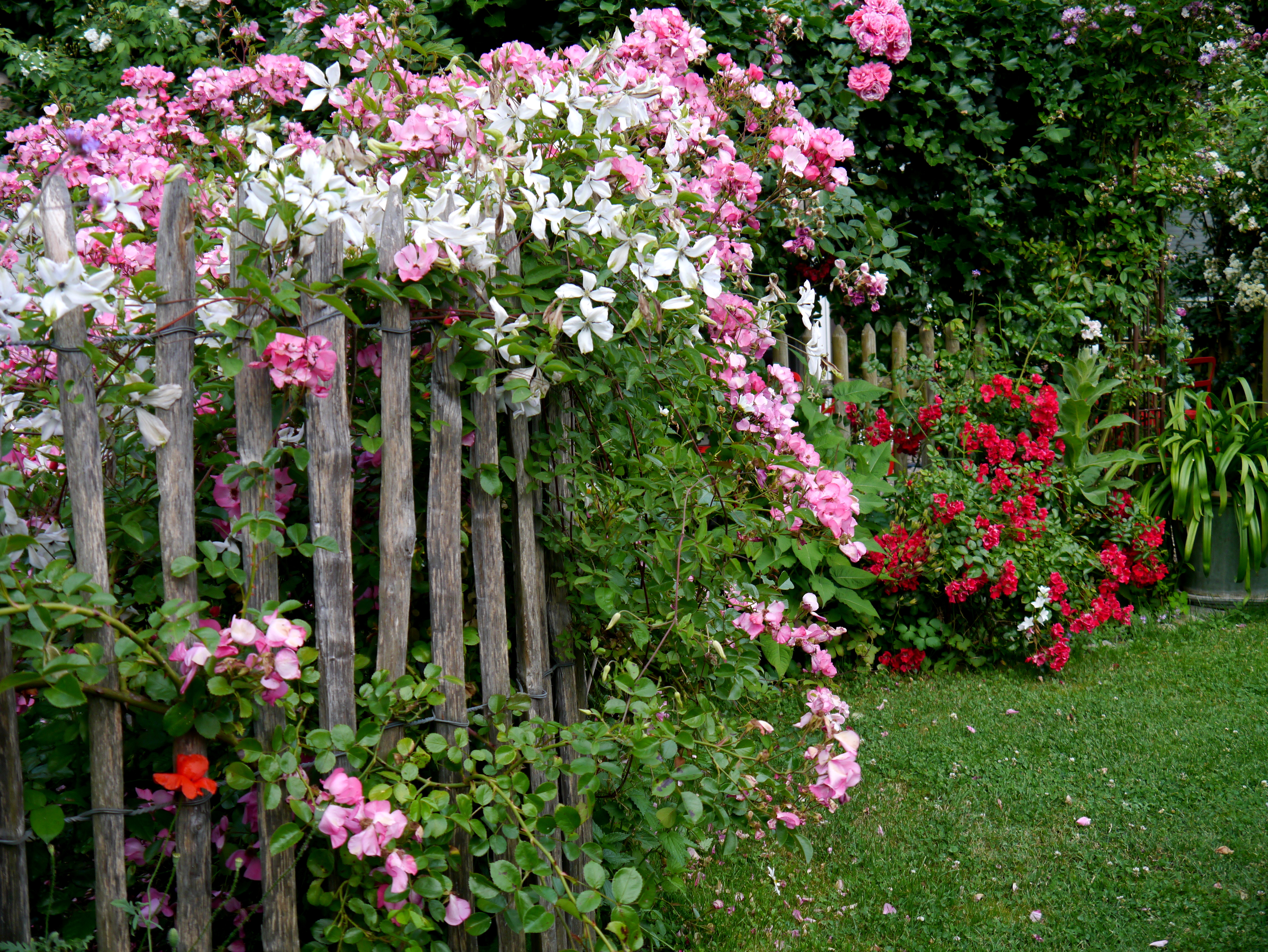 Erst danach löst sich die strenge Gliederung in eine lockere Bepflanzung auf. Ein wellenförmig aufgebauter Staketenzaun ist, der mit Kletterrosen und Clematis bepflanzt ist umrandet ein Beet mit Stauden und Gräsern.