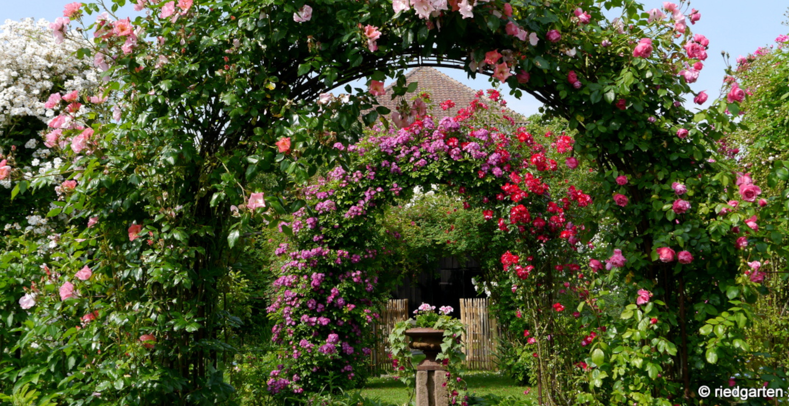 In der Mitte des neuen Grundstücks legten wir ein zentrales Beet für Stauden und Einjährige an. Es wird umkränzt von vier Rosenbögen, die durch Spalierobst verbunden sind. Immer noch in der Symmetrie pflanzten wir einen an vier Stellen geöffneten Kreis von Wildrosen. Erst danach löst sich die strenge Struktur in locker gestaltete Gruppierungen von Gehölzen, Stauden und Gräsern auf.