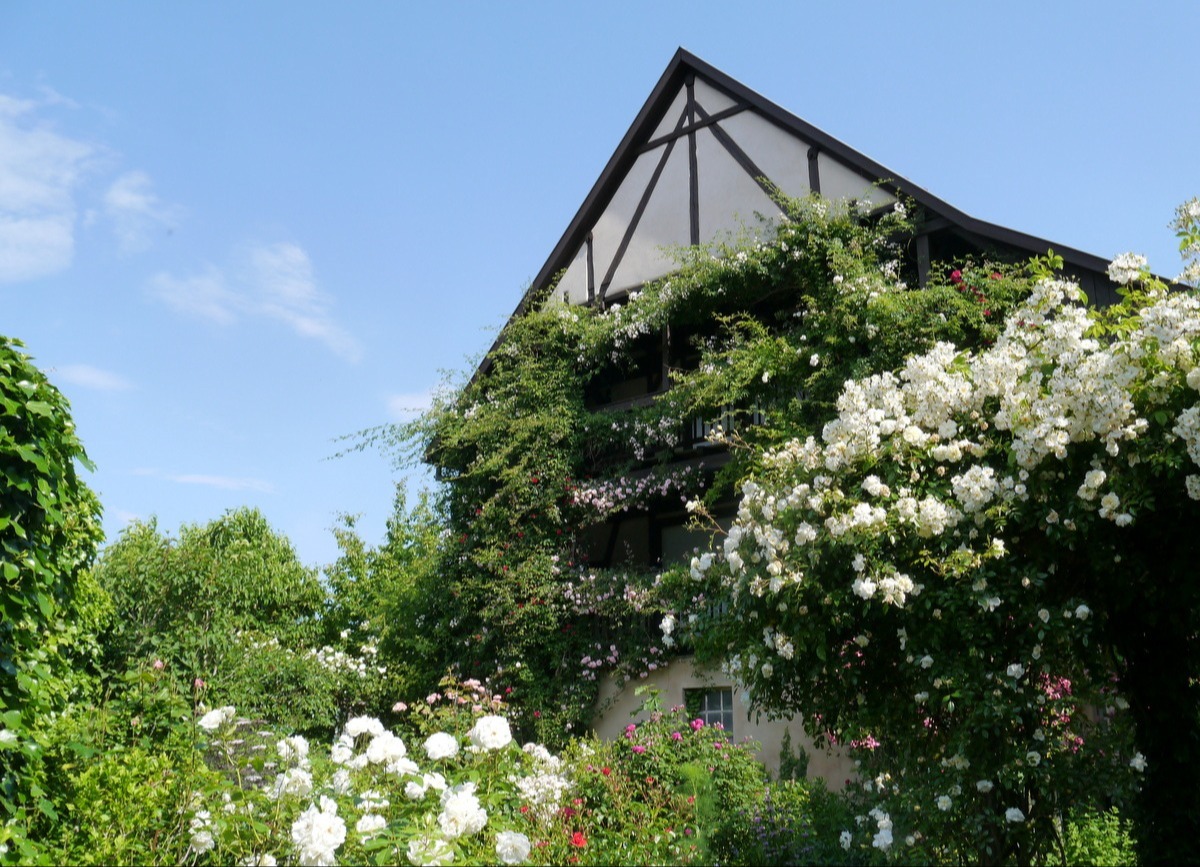 An einer Holzkonstruktion und vor der Fachwerkfassade des Wohnhauses fanden Rambler- und Kletterrosen ihren Platz. Wir achteten dabei auf unterschiedliche Blühzeiten von Ende April bis in den Juli.