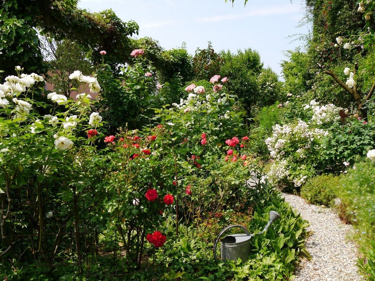 Locker geschwungene Wege umrahmen Rosen- und Staudenbeete.