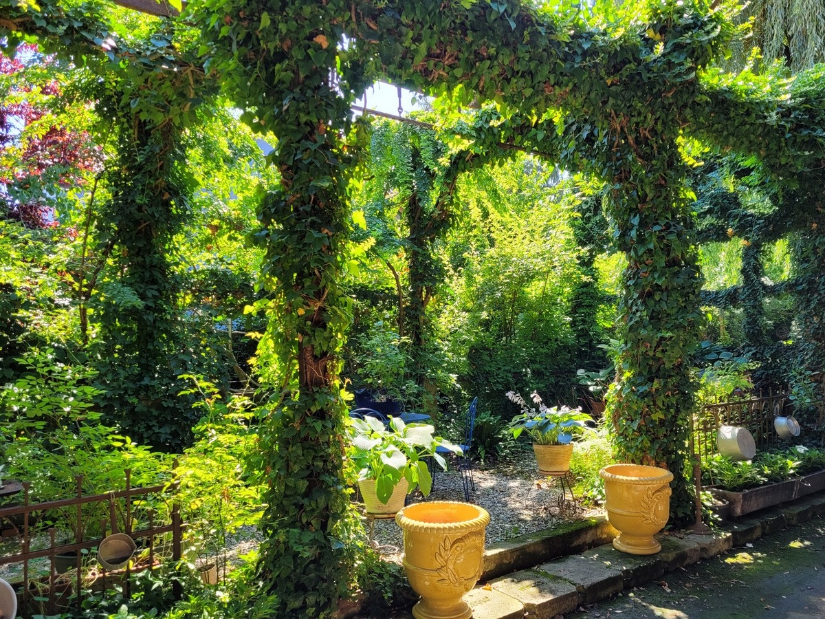 Wir pflanzten zuerst eine ‚kleine‘ Trauerweide, die uns schnell über den Kopf wuchs, und gestalteten die Eisenkonstruktion des ehemaligen Misthaufens mit Kletterpflanzen.